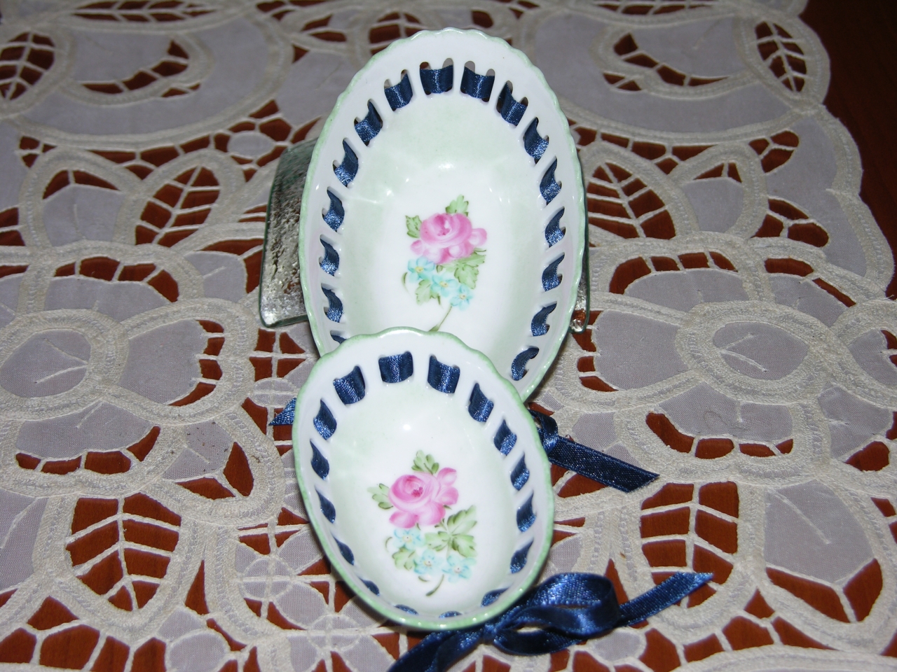 | Coppia di cestini di porcellana ornati da nastro di raso blu. In due diverse misure, raffiguranti Rose e Non ti scordar di me.