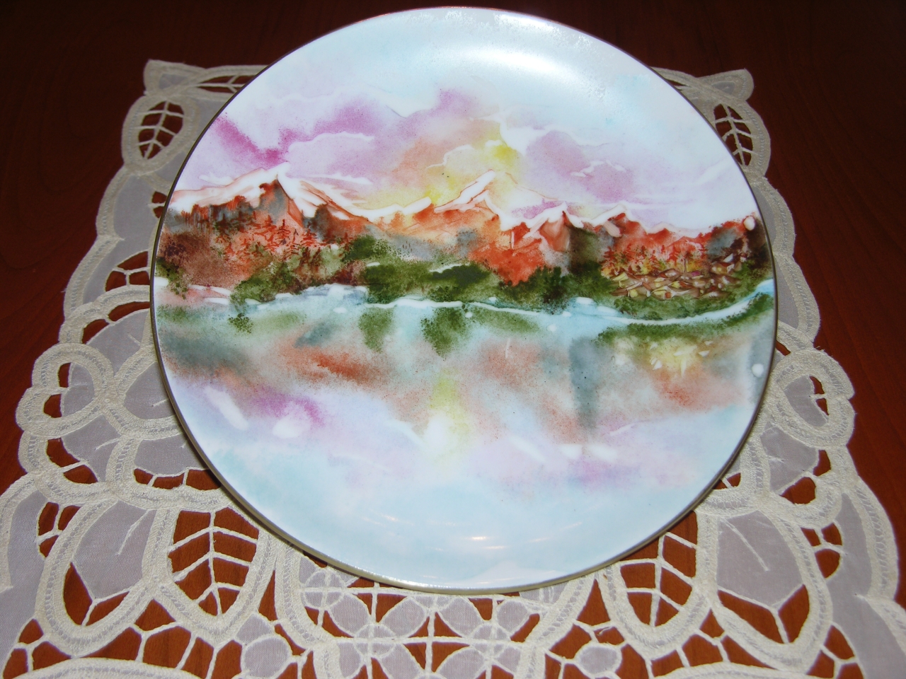 Piatto da esposizione. Coloratissimo paesaggio di montagna al tramonto, delineato da un delicato bordo d’oro giallo. |