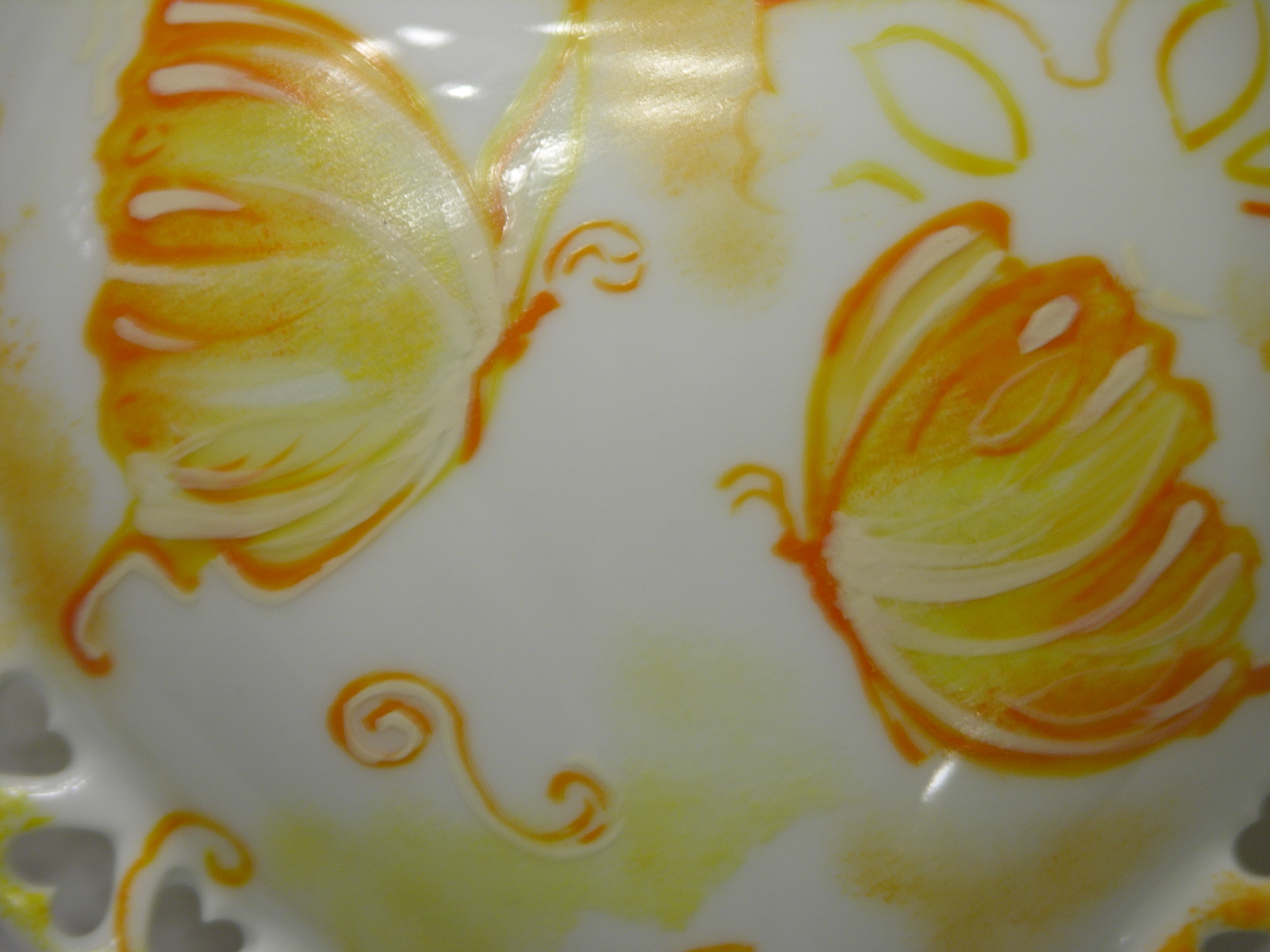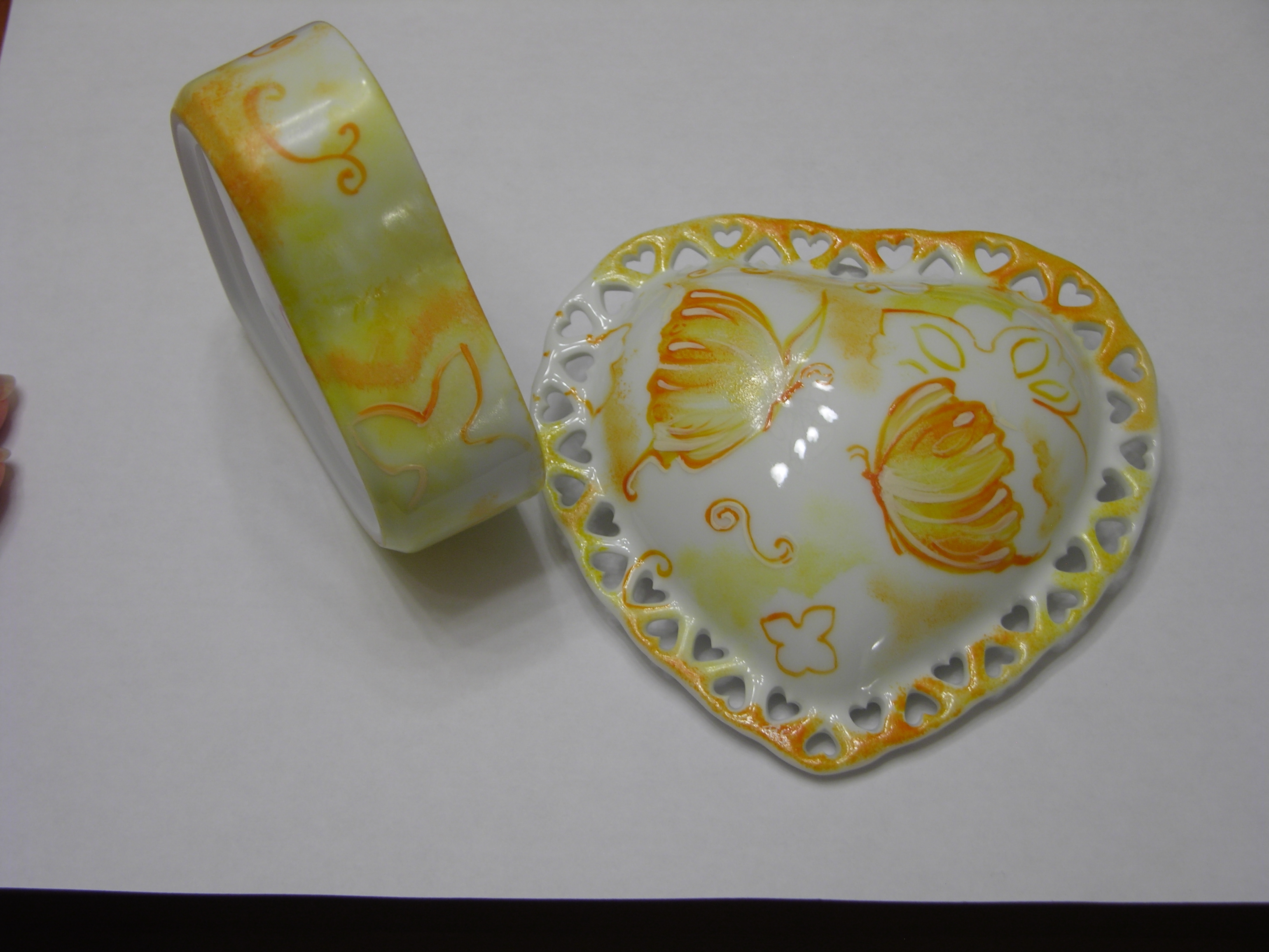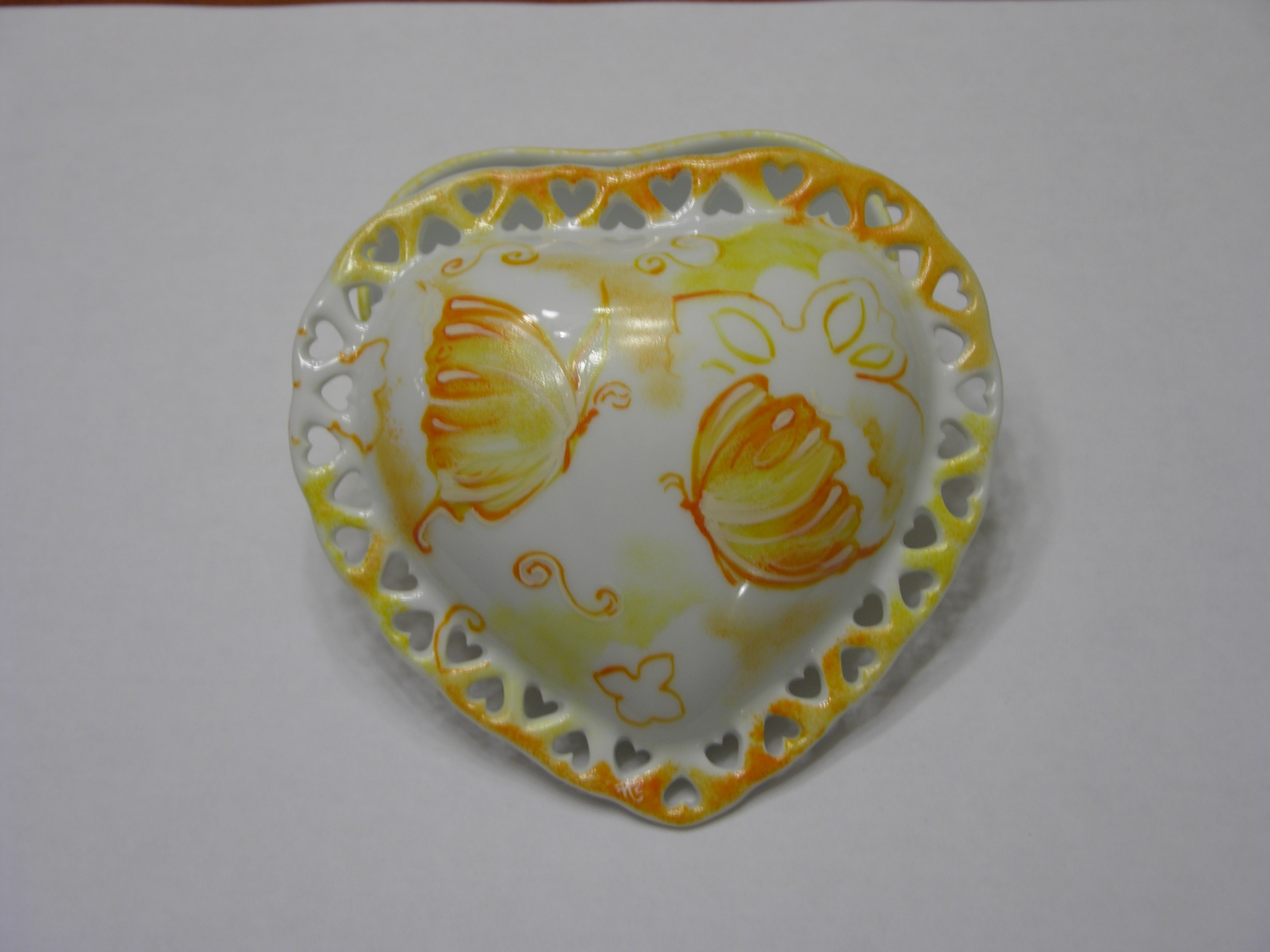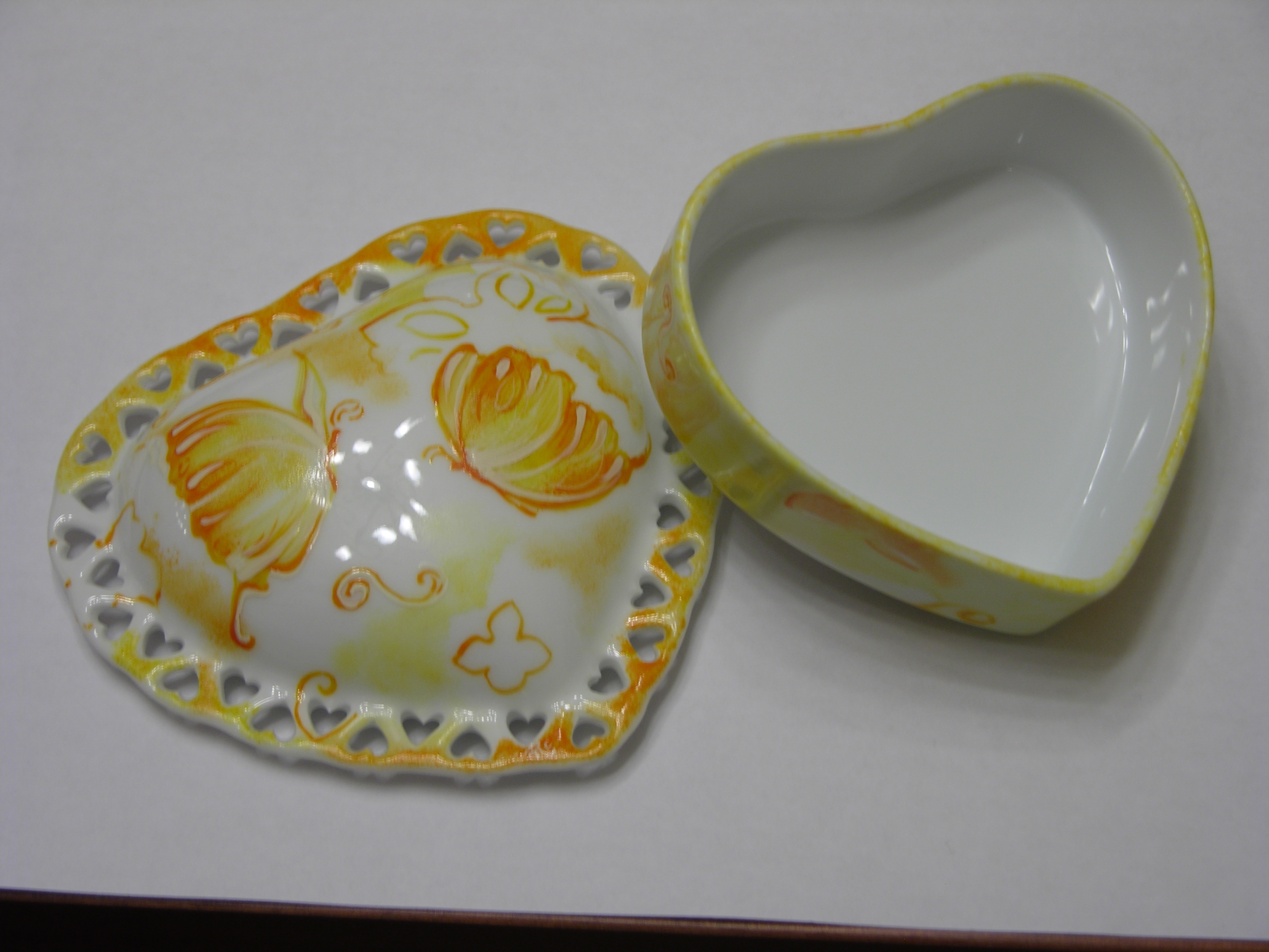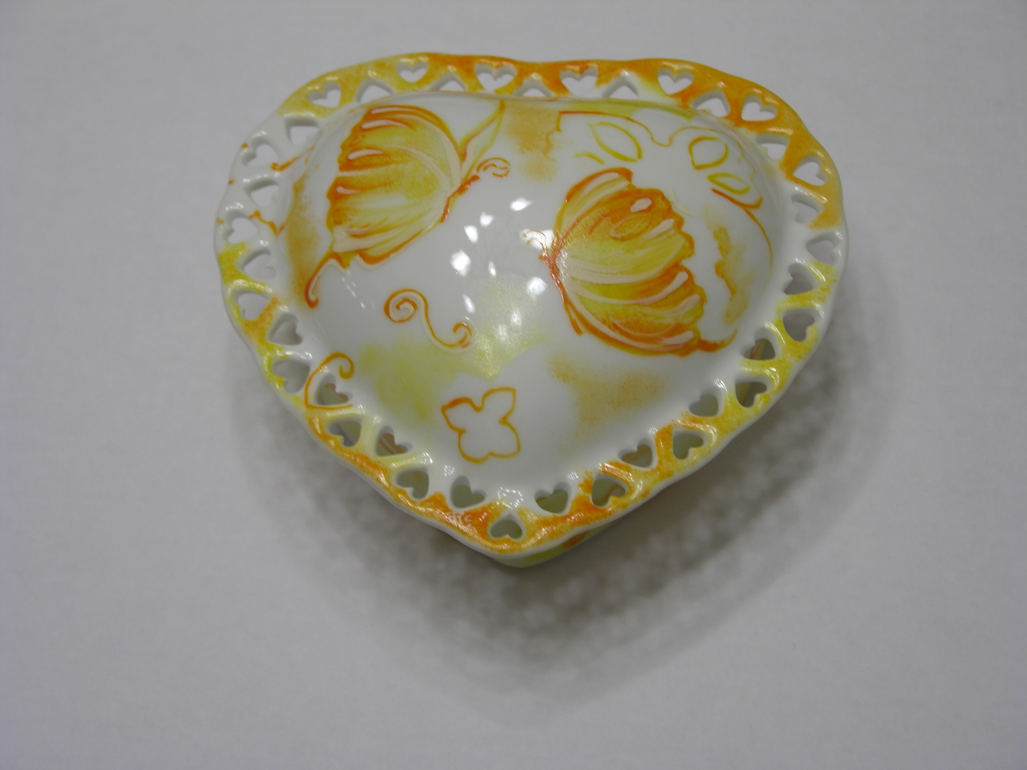 Splendido portagioie in porcellana con una fantasiosa raffigurazione di farfalle giallo e arancio tono su tono, sia sul coperchio che sulla base. |