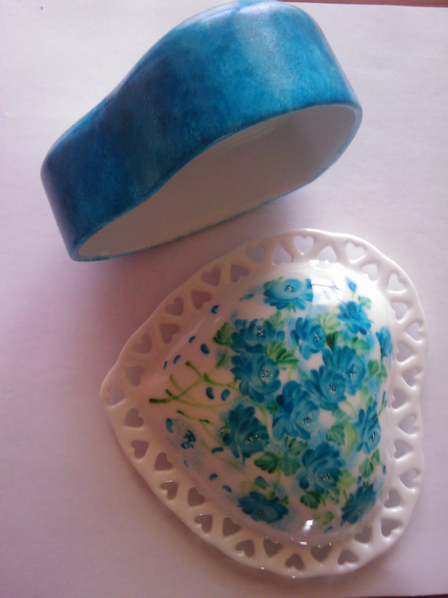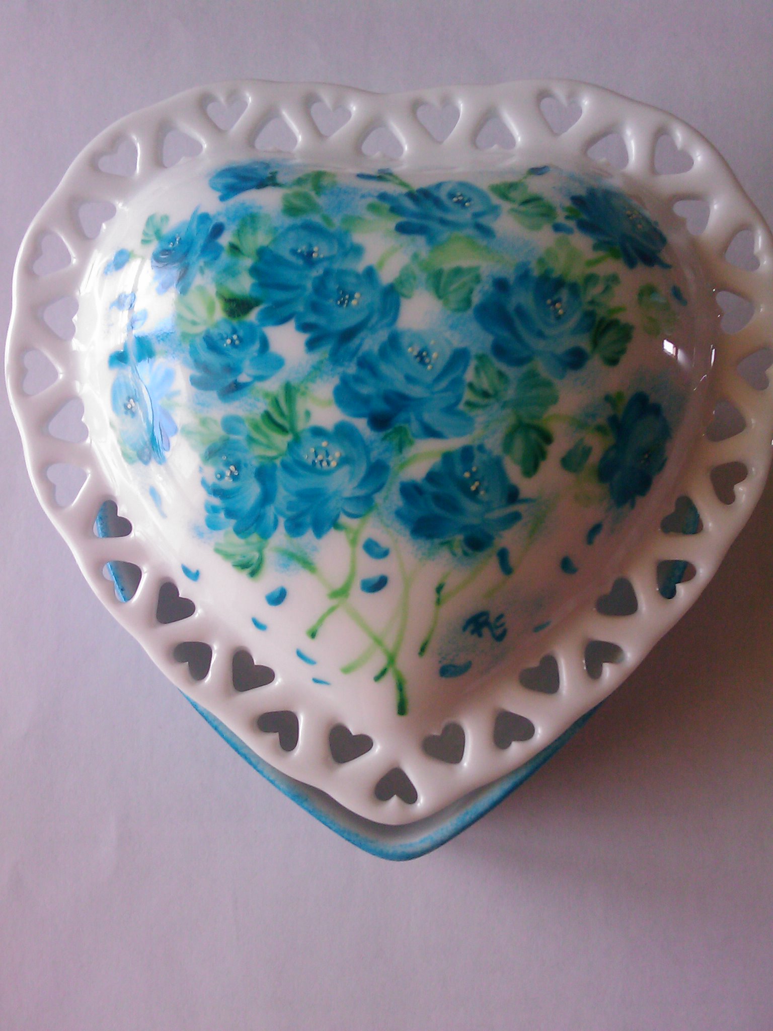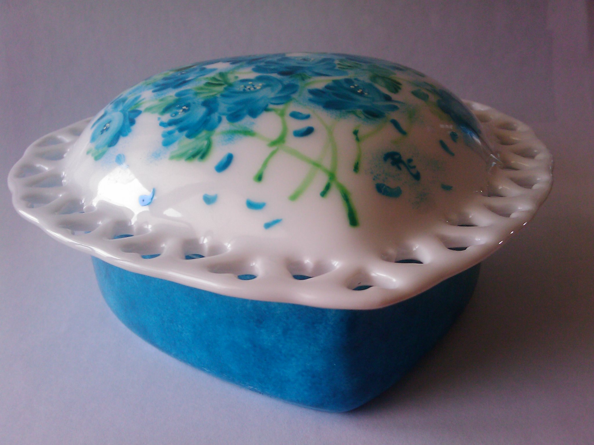 Prezioso portagioie in porcellana, la base è in tinta unita blu, mentre il coperchio è decorato da rose blu e petali. |