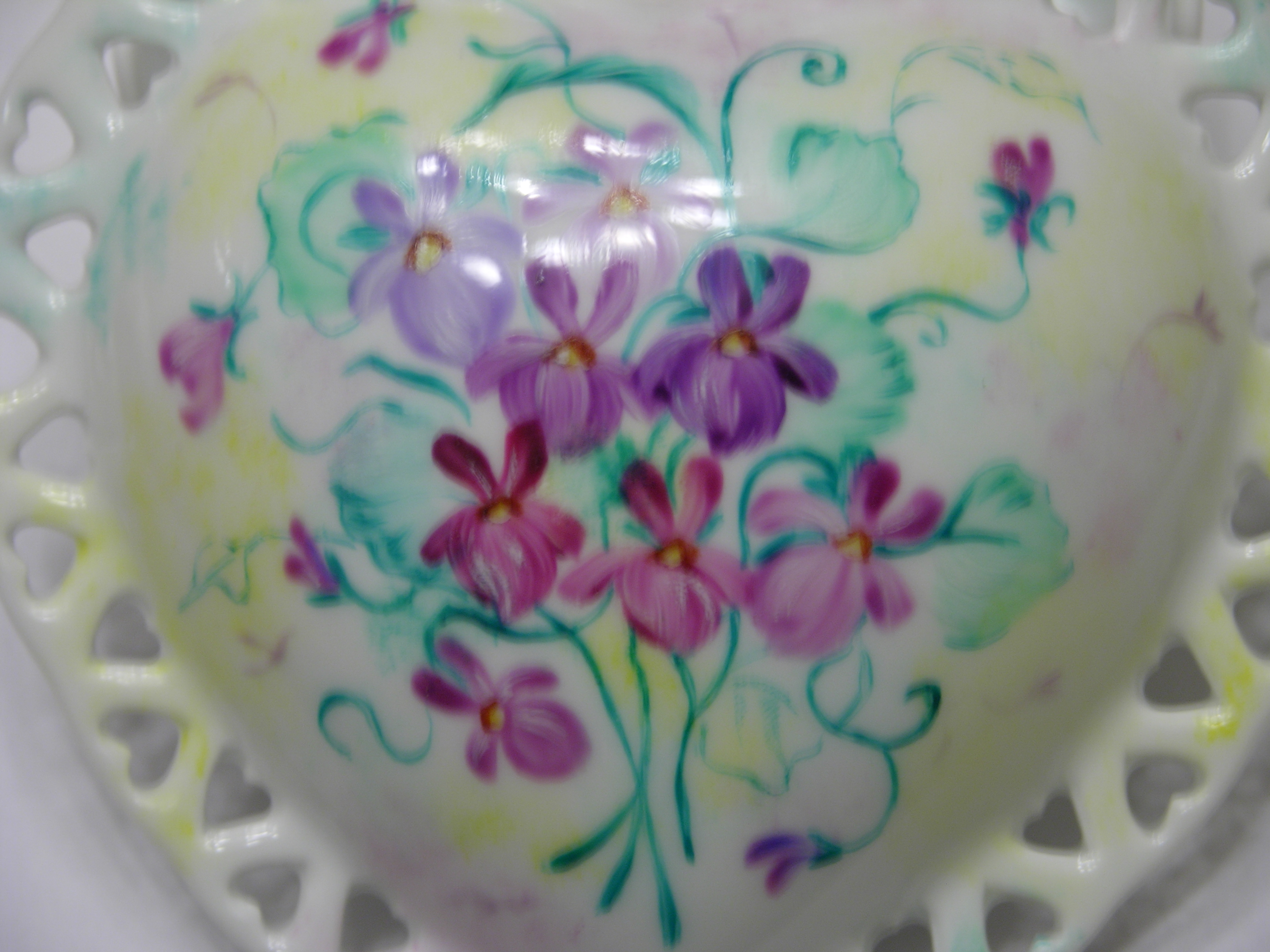 Delizioso portagioie in porcellana valorizzato da un fascio di Violette del pensiero. |