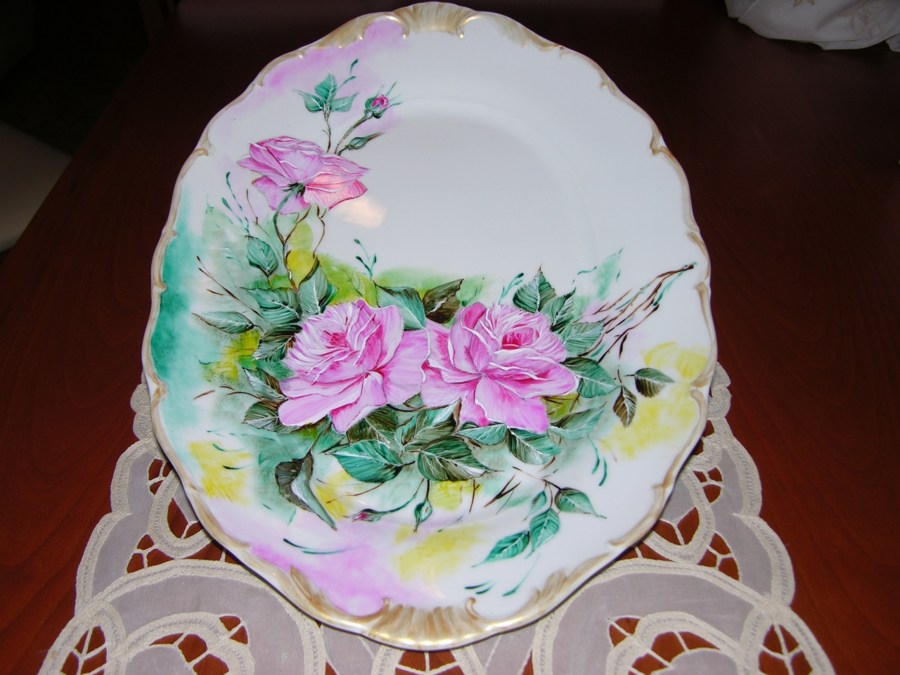 | Vassoio di porcellana fina, splendidamente decorato da Rose ed arricchito da un sottofondo di colori tono su tono rosa giallo e verde.