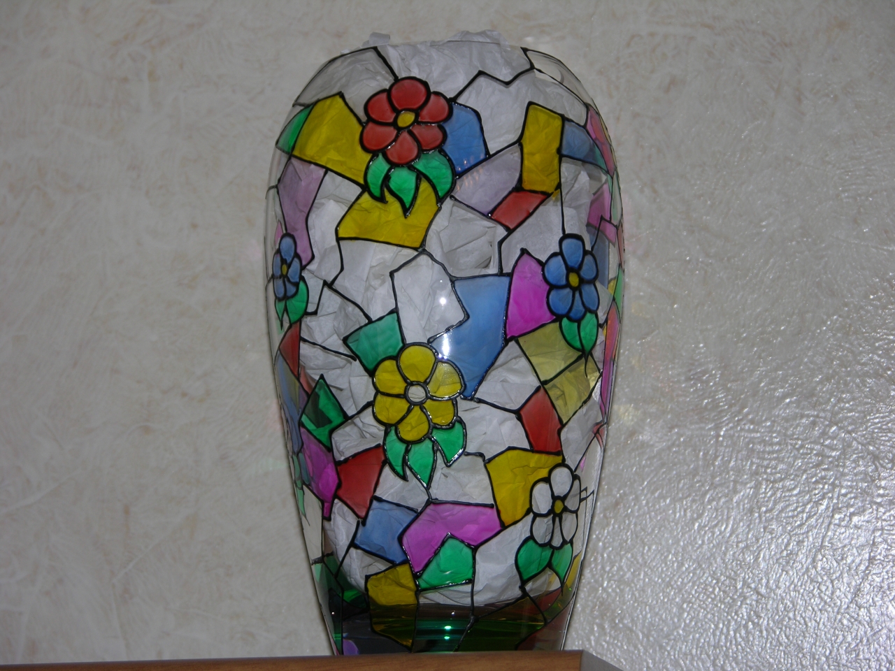 L’intera composizione è stata prima disegnata con la Pasta da contorno Marabu, e successivamente dipinta con colore per pittura su vetro Decor glass Marabu. |